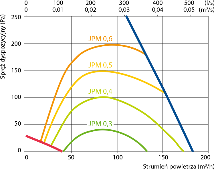 - JPM - 0,34 (W/m3/h), pobór mocy przez napęd wentylatora przy przepływie maksymalnym - 41 W.